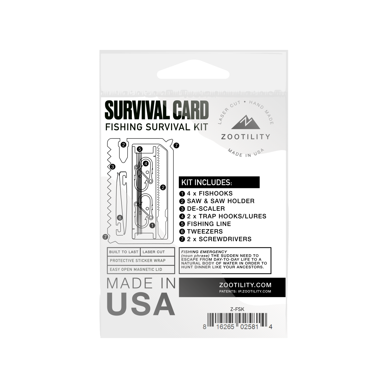 With the Zootility Fishing Survival Kit, you won't just survive – you'll thrive. Remember, in a survival situation, it's not just about the tools you have but the knowledge and determination you possess. So, be prepared and carry confidence in your pocket with the Zootility Fishing Survival Kit – MADE IN USA.
