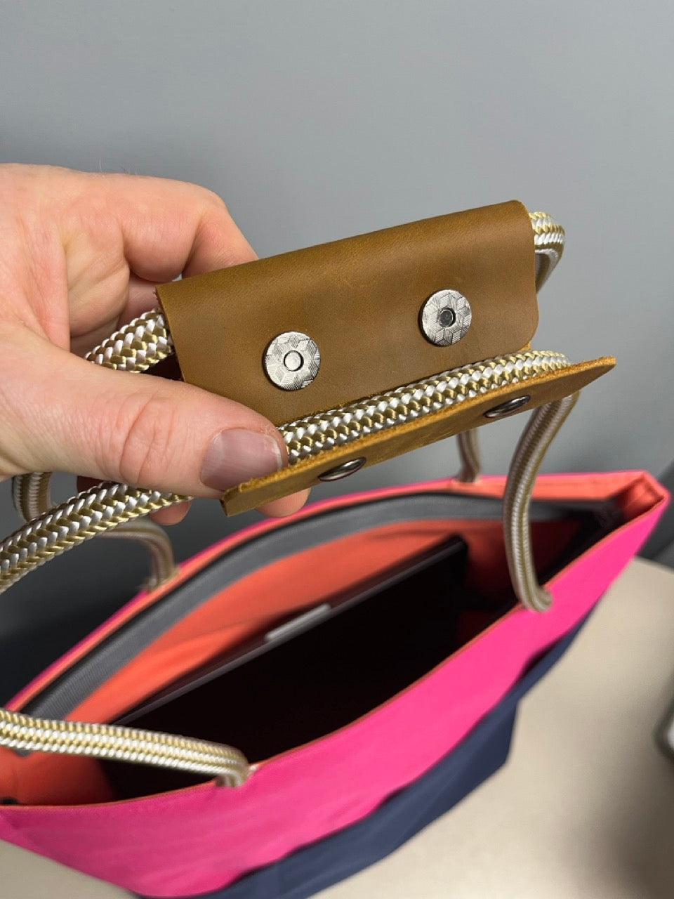 Crafted from thick 9oz waterproof nylon for both the inner lining and outer shell, this tote offers exceptional strength and a substantial body that stands up to daily use. The braided nautical nylon rope handles, connected with leather and secured by a magnetic snap, provide a comfortable grip and a touch of elegance.
