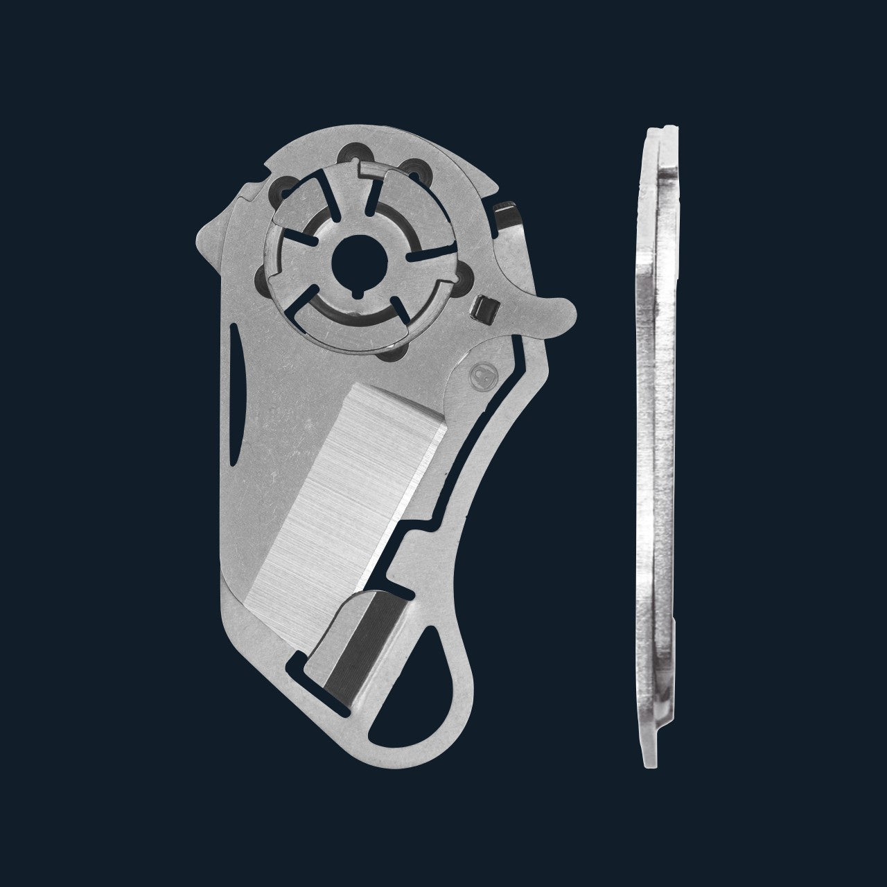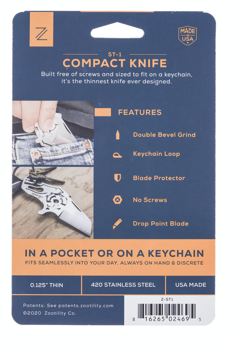 ST-1 is a super thin, ultra compact knife with keychain loop. The ST-1 is one of the easiest knives for convenient storage due to it's 0.125” low profile and patented FlyOff technology. Fits easily in the coin pocket of your jeans. The stainless ST-1 is packaged on a sealed product card.